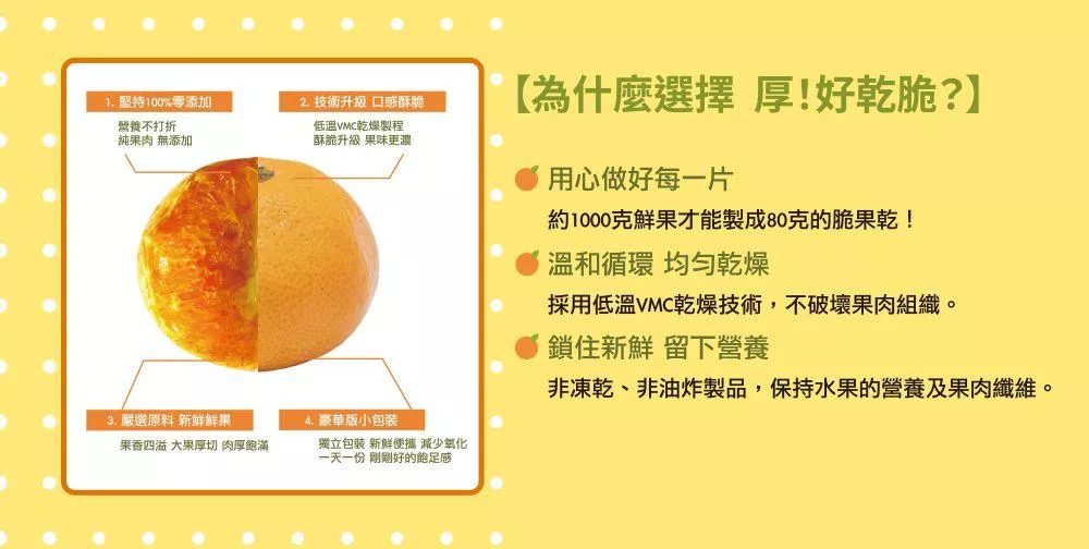 採用台灣最經典的七種水果,水果獨特的風味,厚切的口感,再經VMC低溫乾燥技術製作,保留了水果原始風味和口感,同時質地更加厚實,帶給您全新的口感體驗。